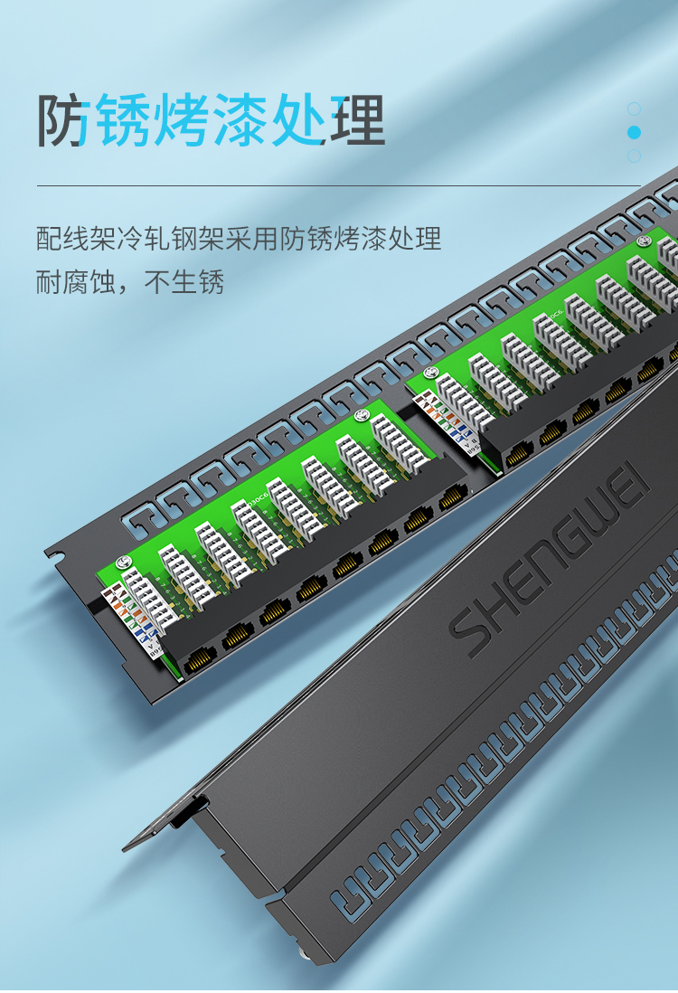 加厚冷軋鋼架,牢固不變形,連接不松動,采用加厚冷軋板打造,一體成型,堅固耐用,附有T568A/T568B通用打線標識,滿足多類布線要求。
